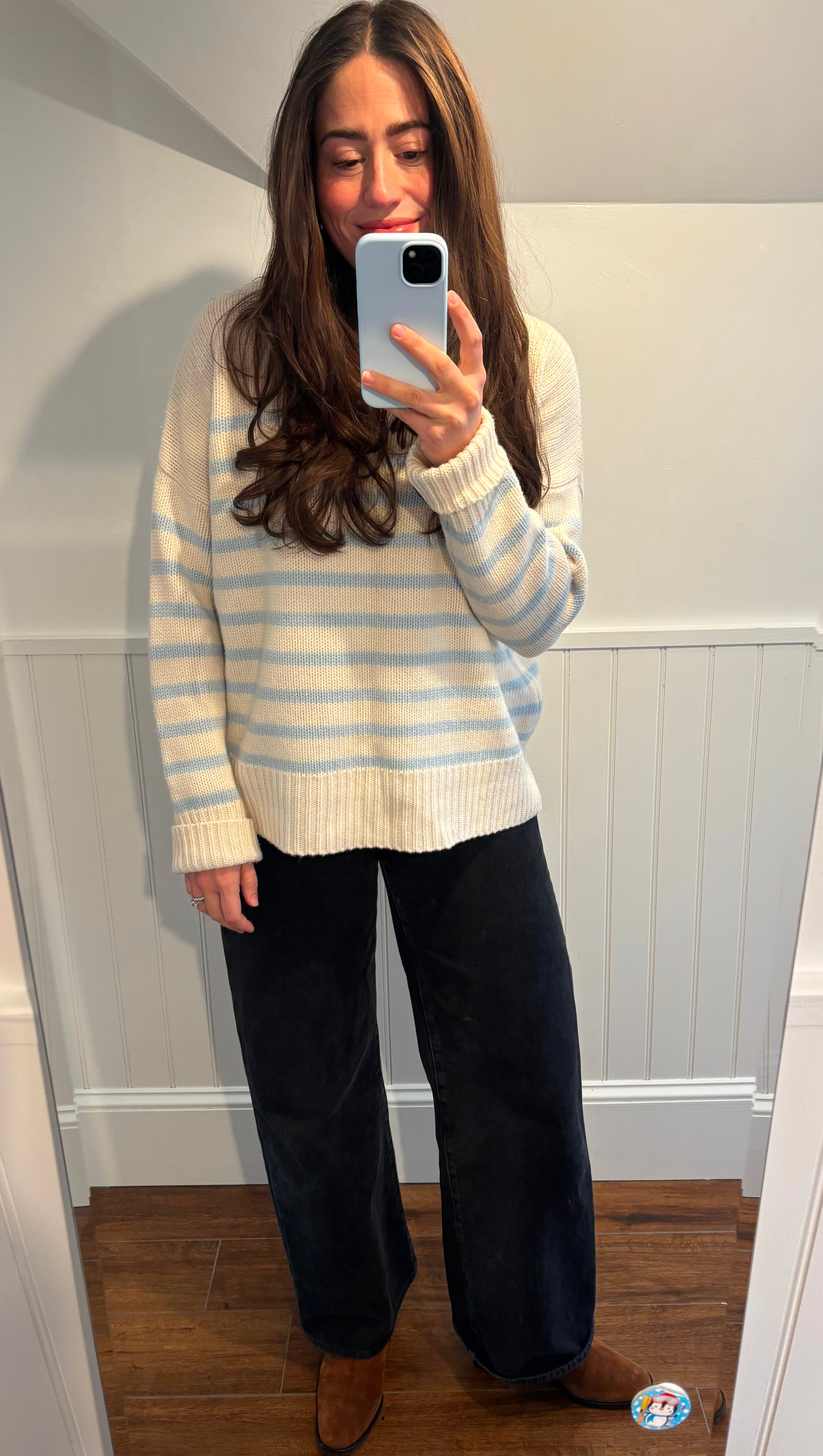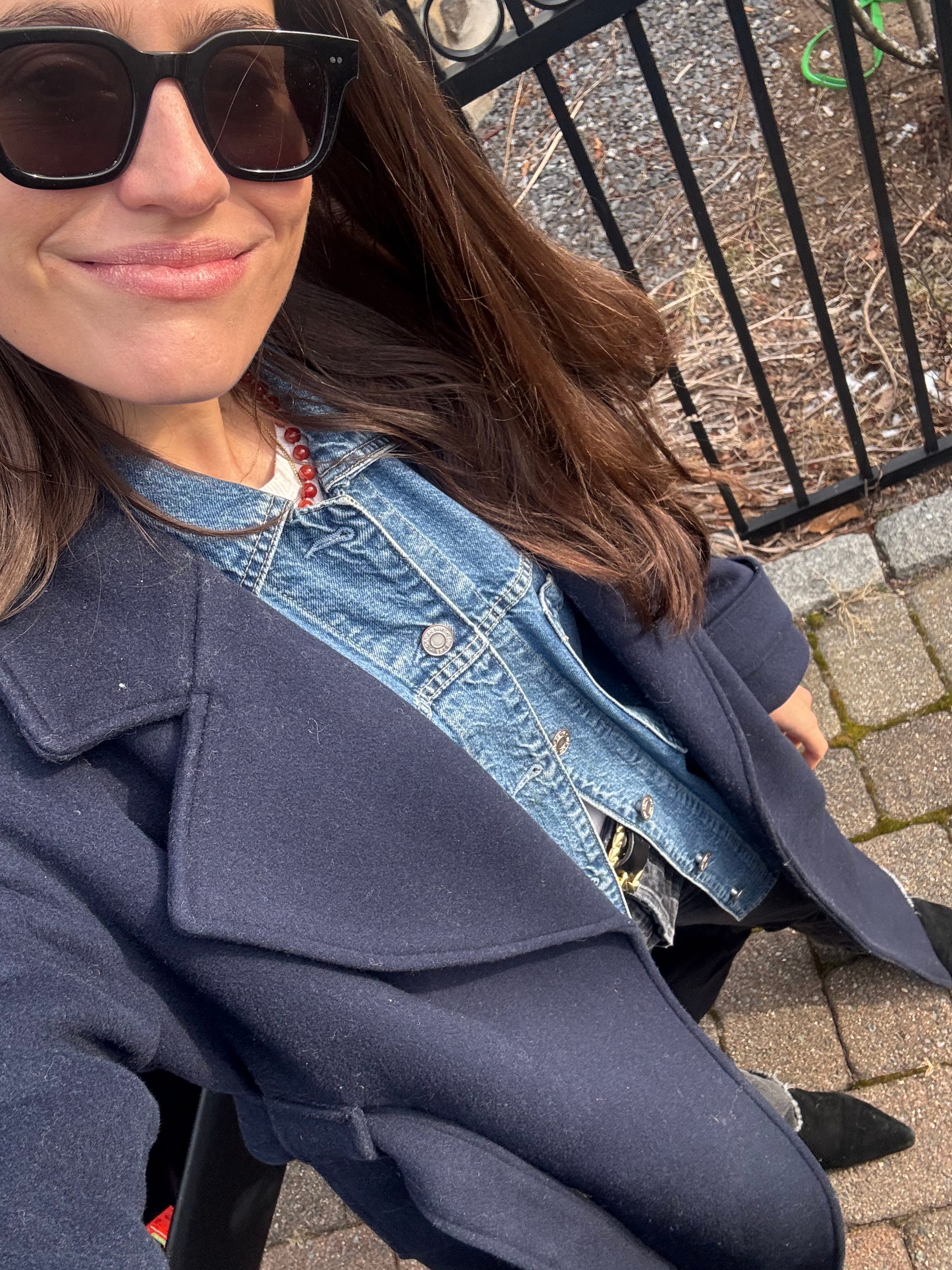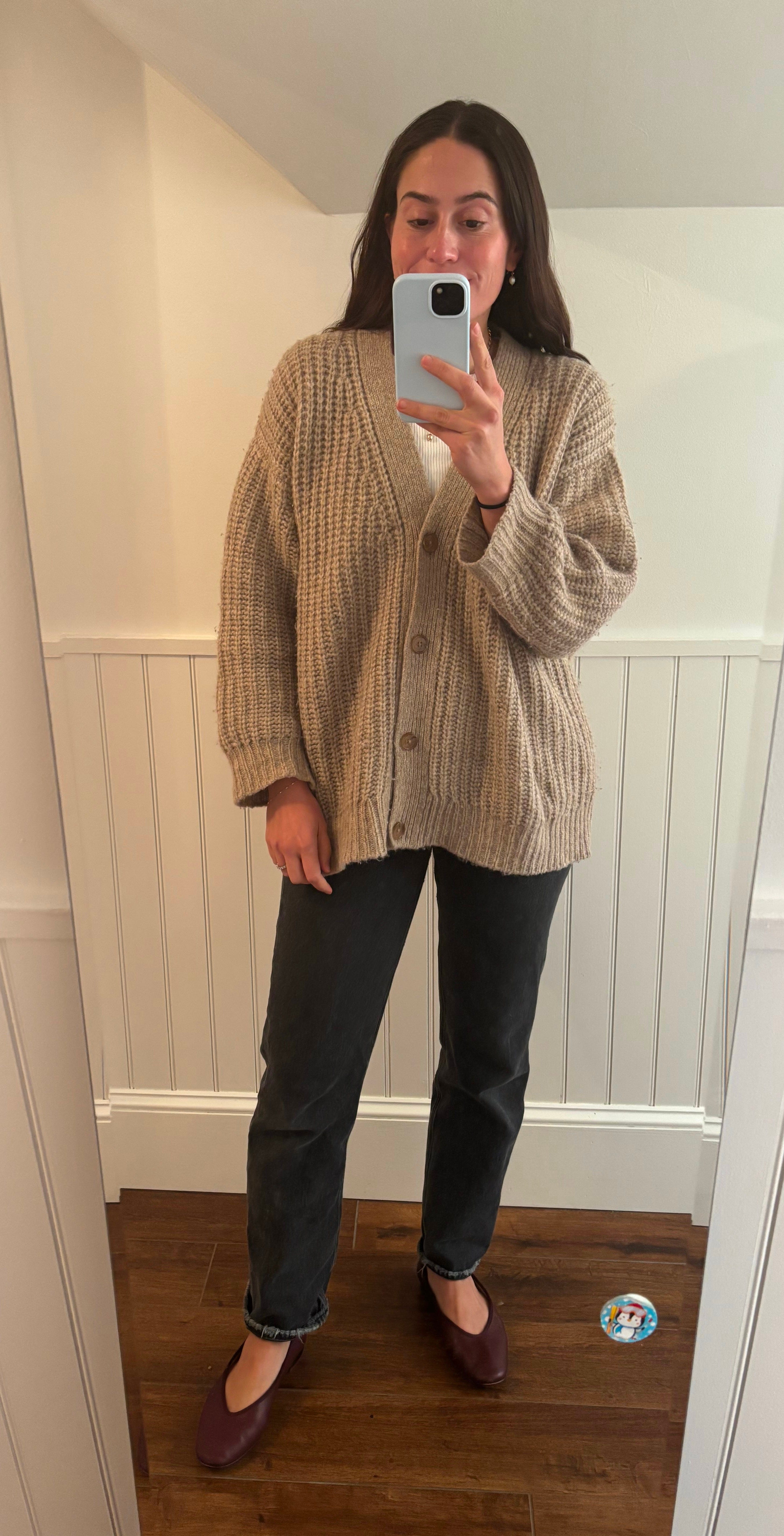 Worn for: On Fridays, I typically work from home, and have slightly fewer meetings. That means that I will often work out a little later in the morning, and stay in workout clothes until I have a break in my day that I can use to take a quick shower and get fully dressed. (In my life, getting dressed usually happens first thing in the morning, but it most certainly does not have to happen first thing in the morning!) I ended up spending most of the day in my workout clothes trying to get through a slue of things before officially calling it for the weekend (and took advantage of my walking pad while doing it!) But, I took my daughters for a little Friday Treat (trademarked in our house!) to get some cookies and visit my mom, so I took a little time midday to pull myself together. I used many tricks in my book here to get ready quickly — wore something you wore recently (the jeans), with something you know works (an oversized sweater), add a layer (a ribbed long-sleeve underneath both for texture and warmth). And then, because it was above 30 degrees, I took advantage of being able to expose my ankles because it brought me great joy!