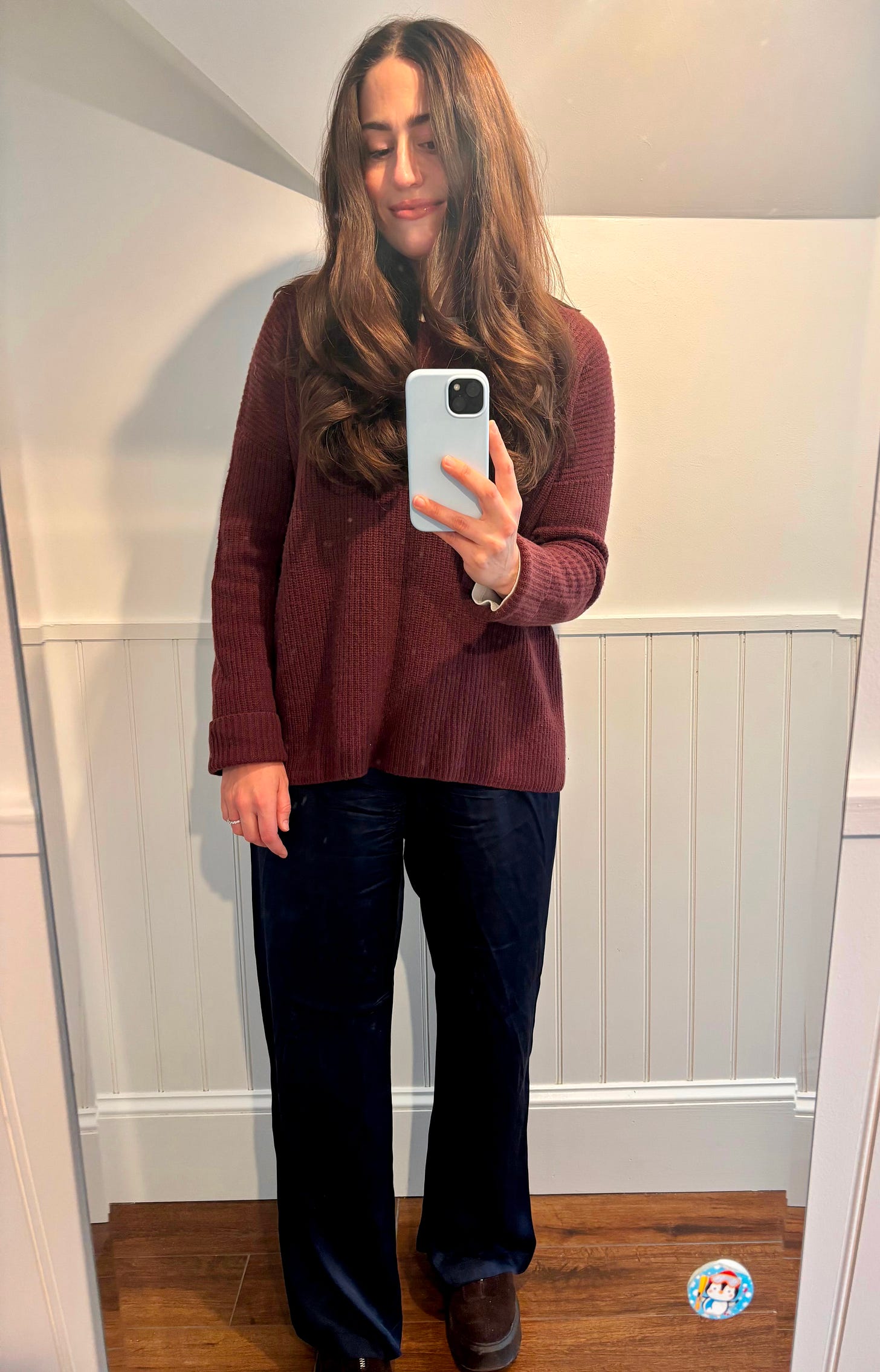 I am still going strong with the blue + red/burgundy combos - it is unlocking LOTS of new stuff in my closet! Worn for: a day in my office. I have owned this Vince sweater for over a decade. When I bought it, it was close to the most I had ever spent on a single item of clothing. But, this is a lesson in why fabrication matters — high-quality, 100% cashmere - I’ve worn this every single winter since I’ve owned it and it’s in amazing condition. EVERY time I buy a not-great-quality sweater, I regret it. I try very hard to keep a promise to myself that if it’s not wool, cashmere, or cotton, I will regret it, therefore I won’t buy it. The pants are donni and I love them. And the boots are a blatant dupe of The Row and they work great for me!